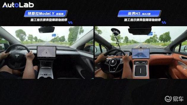 除了以上场景,用车时可能也会出现一些危险的情况,比如遇到施工和“不讲武德”的司机,我们在场地进行了还原。场地内只有尚界H5 Max版和特斯拉Model Y可以开启领航功能,两车都展示出了极强的避障能力。