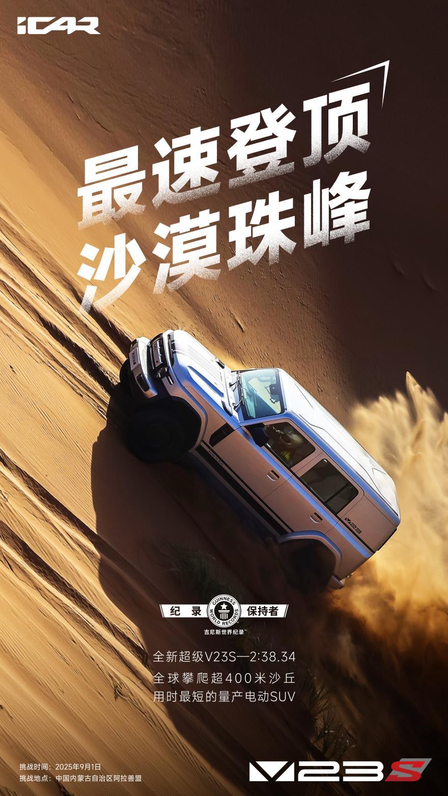 更值得一提的是,iCAR超级V23S还以2分38秒34的成绩,刷新了登顶沙漠珠峰的吉尼斯世界纪录,在高海拔环境下,电池、电机、四驱系统全程稳定输出,无任何性能衰减,展现出强大的越野实力。