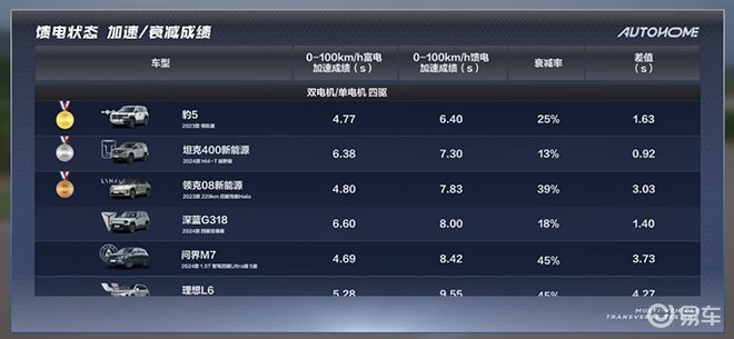 Tank 400 Hi4-T在通电状态下的0-100km/h加速时间为7.3秒,仅比完全充电状态低0.92秒,衰减率仅为13%,在所有测试车辆中排名第一。处于馈电状态的Tank 400 Hi4-T不仅保持了其动力优势,还依靠越野混合动力架构Hi4-T实现了可持续的强劲动力输出和智能能源管理,使每一次驾驶旅程都“动力、电气化和节能”。