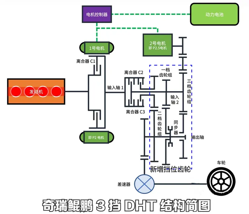 而这套系统最大的亮点,其实也还是着落在3挡DHT变速箱上,它和吉利的3挡DHT不同,号称是行业首台双电机DHT,也就是说骑在变速箱上的P2.5发电机也能参与驱动。