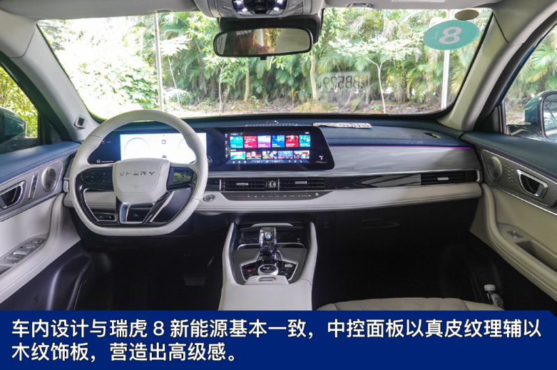 瑞虎7新能源冠军版内饰设计基本没变,以蓝米双拼色为主,简洁大方。