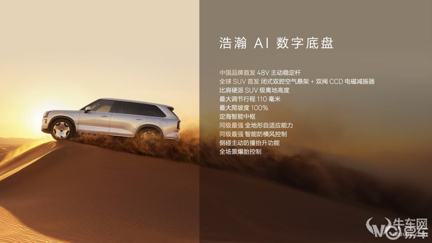 浩瀚AI数字底盘首次将AI算力引入底盘域,打造定海智能中枢,实现由“事后跟随”到“提前预判”的姿态控制进化。在极限场景中,即使在120公里/小时高速湿滑路面同侧双轮爆胎,极氪9X依然能稳稳刹停。在越野场景中,浩瀚AI数字底盘赋予极氪9X同级最强智能全地形自适应能力,可自动识别深雪、泥地、沙地、岩石等7种特殊地形,并智能匹配专属驾驶模式。