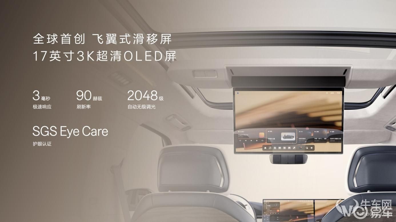 除了顶级音响,极氪9X还带来全球首创的飞翼式滑移屏。这块17英寸3K超清OLED屏由三星供应,可在二三排间电动无级滑移88厘米,并支持5档角度调节,让全车乘员都能舒适使用。其低蓝光的护眼认证,也确保全家观看无忧。