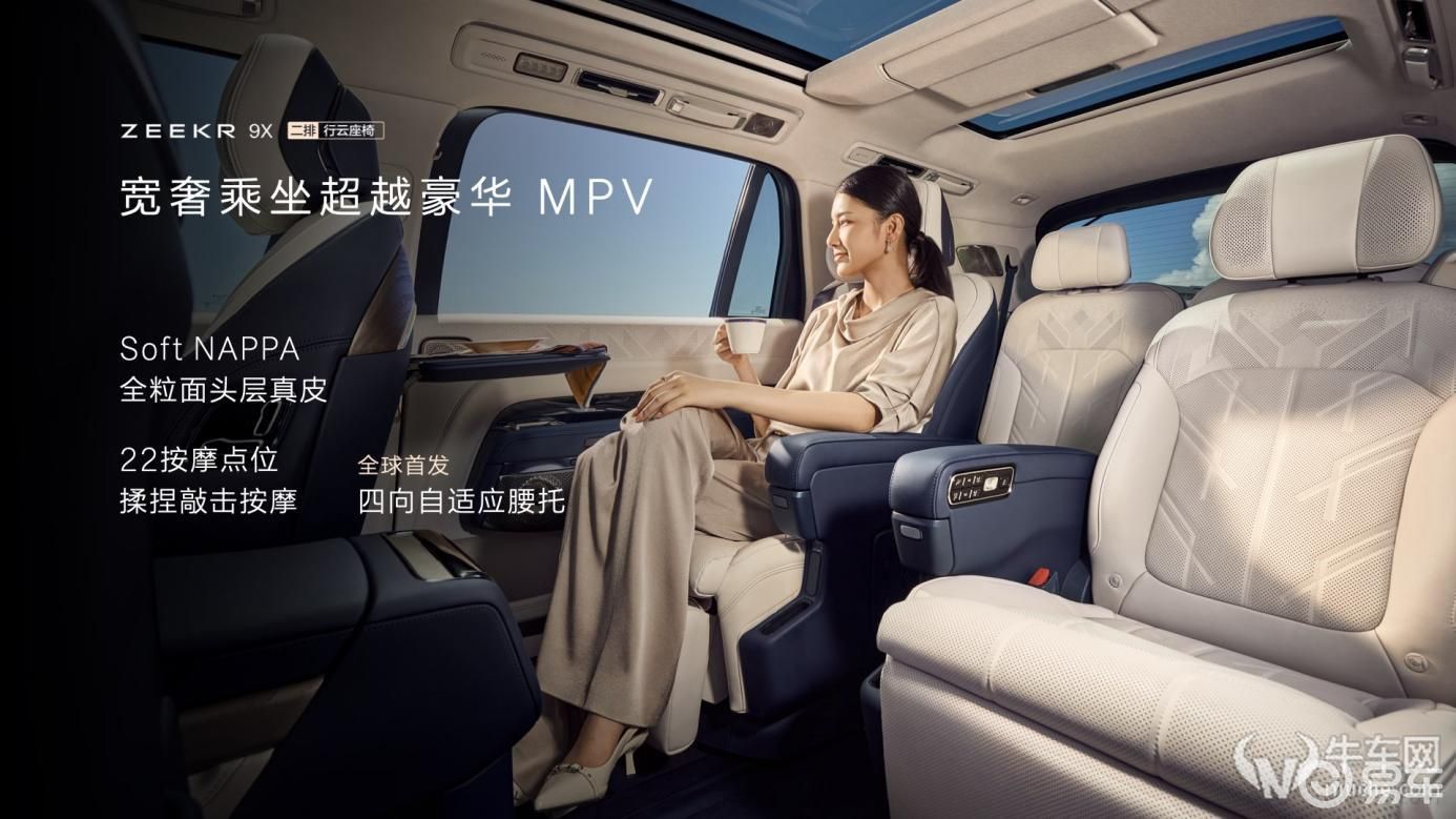 极氪9X的二排配备两把SUV中最舒适的独立行云座椅,拥有超越豪华MPV的宽大坐垫、009同款梦幻回弹海绵,以及行业首发智能腰托和22点位按摩理疗功能。行云座椅可一键进入零重力座椅模式,腰部和腿部角度参考NASA标准,开发阶段邀请300多位潜在用户实测优化,带来更大145度躺角和23度的坐垫上翘角度。行云座椅还可切换伊姆斯躺椅模式,配合全系标配的同级最大9升智能冷暖恒温冰箱,无论商务洽谈还是旅途休闲,都能享受顶级舒适与尊崇。更具匠心的是,二排座椅可旋转180度与三排形成对坐模式,变成一个面对面的私人空间。