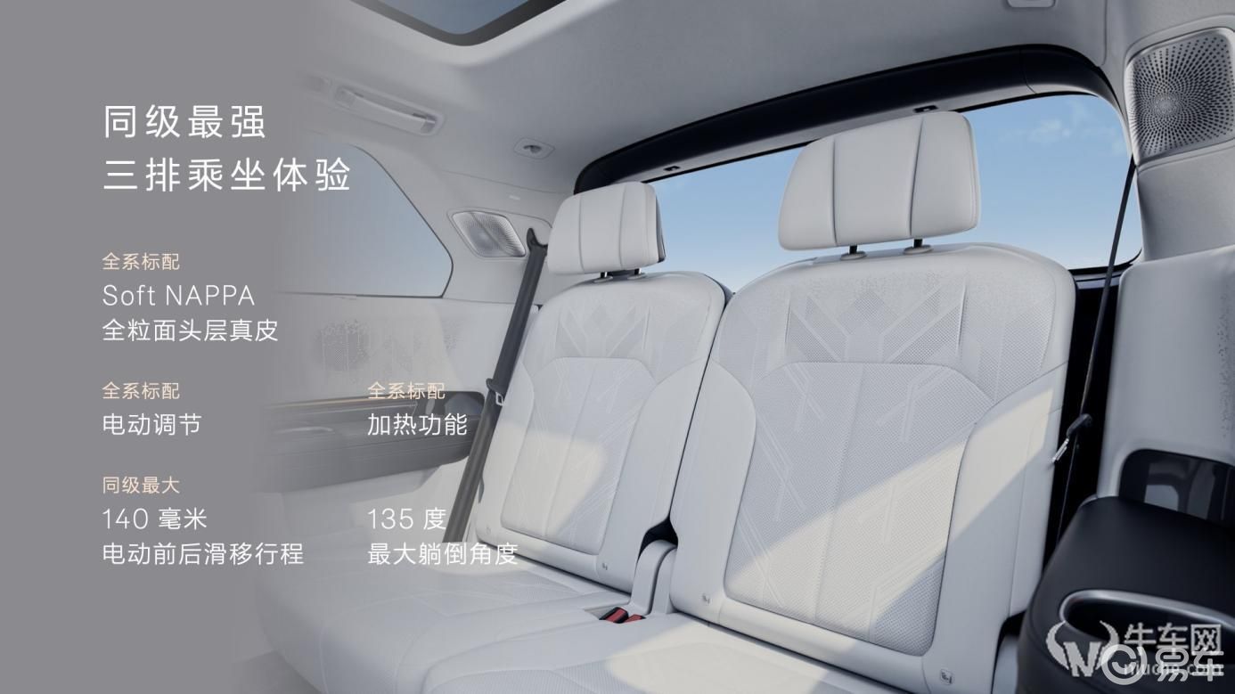 第三排同样不打折。极氪9X采用一体式压铸后端铝车身与强化CD柱结构来保护碰撞安全,能承受时速105公里的追尾与侧碰冲击。第三排还拥有同级最强的乘坐体验,最大135度躺倒角度与同级最大140毫米电动滑移行程,加上专属独立天窗与“坐坐高升”布局,让第三排成为通透明亮的阳光房。