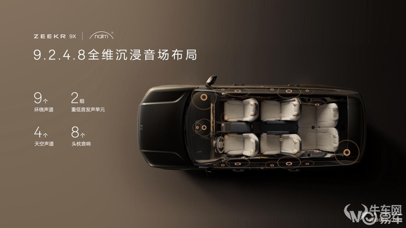 同时,极氪与英国皇室御用音响品牌Naim深度合作,为极氪9X联手打造全球最大功率的车载音响。它拥有3868瓦的峰值功率,32个扬声器,支持杜比全景声,采用9个环绕声道、4个天空声道、8个头枕音响及2个低音炮,让每个座位都能享受殿堂级沉浸音效。