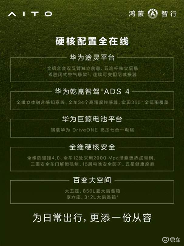值得关注的是,全新问界M7增程长续航版悉数保留了在售车型的核心配置,硬核配置全面在线。华为途灵平台搭载全铝合金双叉臂独立前悬、五连杆独立后悬、双腔闭式空气悬架、连续可变阻尼减振器,兼顾舒适性与驾控质感;华为乾崑智驾ADS 4辅助驾驶系统配合34个感知硬件,可实现对动静态目标(含异形物体)的全场景和全天候感知,提升雨雾尘恶劣天气的安全性,以及对后向悬浮物、负向场景的识别,实现360度全覆盖;三电系统基于华为巨鲸电池平台打造,搭载华为DriveONE高压七合一电驱系统;全维防碰撞4.0显著提升行车安全,全天候守护用户驾乘全程。