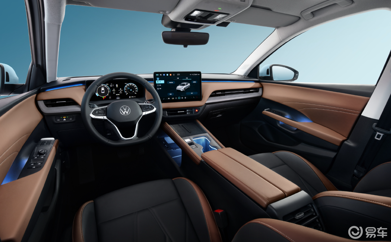 内饰方面,采用双联屏布局,12.9英寸悬浮式中控屏(支持AR实景导航) + 10.25英寸全液晶仪表,UI界面简洁流畅;方向盘、后视镜、灯光等关键功能仍采用物理按键。中控台、门板及座椅采用软质包裹与双缝线工艺,棕色+黑色双拼配色提升高级感;舒适配置包括主副驾座椅加热、方向盘加热、无线充电、Type-C接口、30色氛围灯、带阻尼中央扶手等一应俱全。