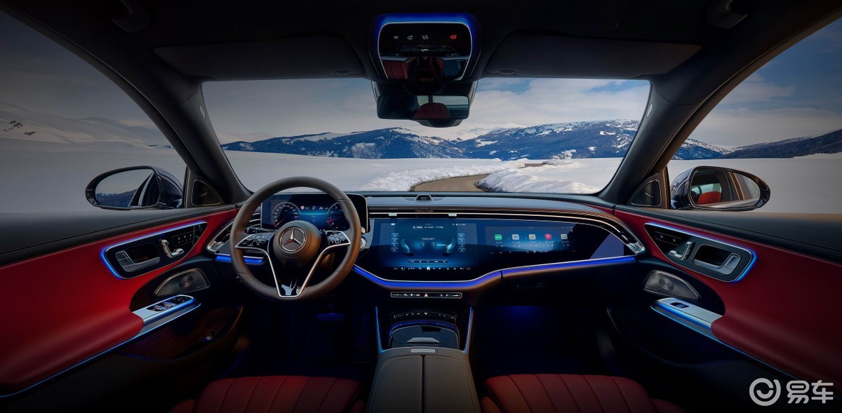 奔驰E级内饰则延续了“S级同款”的豪华氛围,展翼式中控台搭载12.3英寸悬浮液晶仪表+14.4英寸中控屏,高配车型还提供12.3英寸副驾娱乐屏,带来强烈的科技感与豪华气息。车内大面积采用皮质包裹,搭配64色氛围灯,中高配车型提供柏林之声21扬声器系统,营造出沉浸式舒适空间。